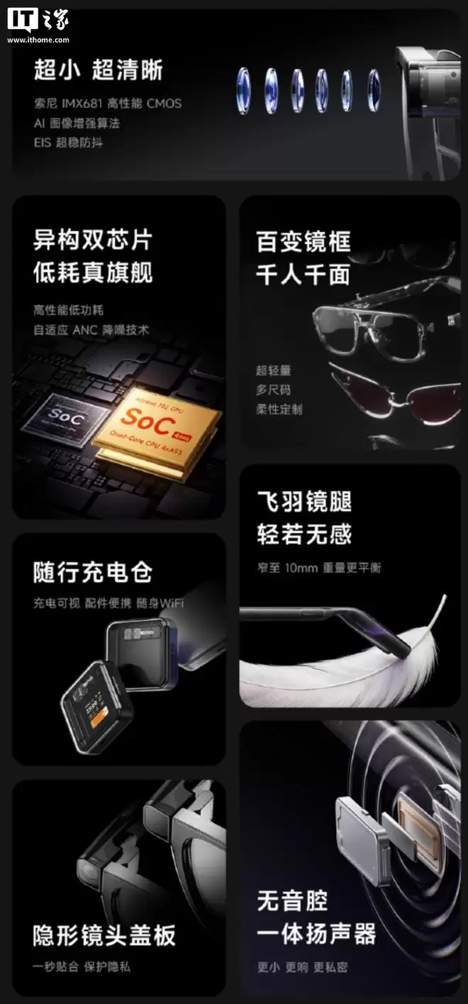这款产品提供了多种镜框样式供用户选择,镜腿纤薄,厚度仅10毫米,并配备了无音腔的一体式扬声器。产品随附一个采用随身透明风格设计的充电舱,搭载了LoomOS 2.0系统,宣称能够实现全天候的主动式AI录制功能。