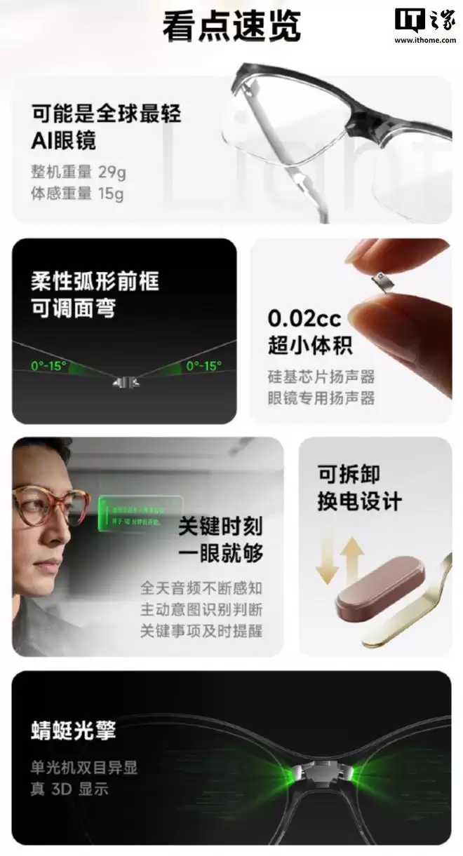 官方最新表示,这款产品“可能是全球最轻的AI眼镜”,整体重量仅为29克。其主打“单光机双目异显”技术以实现3D视觉效果,同时产品内置了0.02cc超小体积扬声器。镜腿部分采用了可拆卸更换电池的设计。