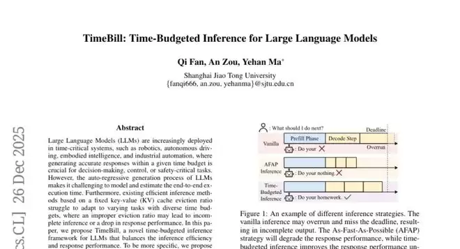 这项由上海交通大学的范琪、邹安和马叶涵领导的研究团队在2025年12月发表的突破性成果,为解决大语言模型在实时系统中的应用难题提供了全新方案。研究论文题为"TimeBill: Time-Budgeted Inference for Large Language Models",已于arXiv预印本平台发布,编号为arXiv:2512.21859v1。