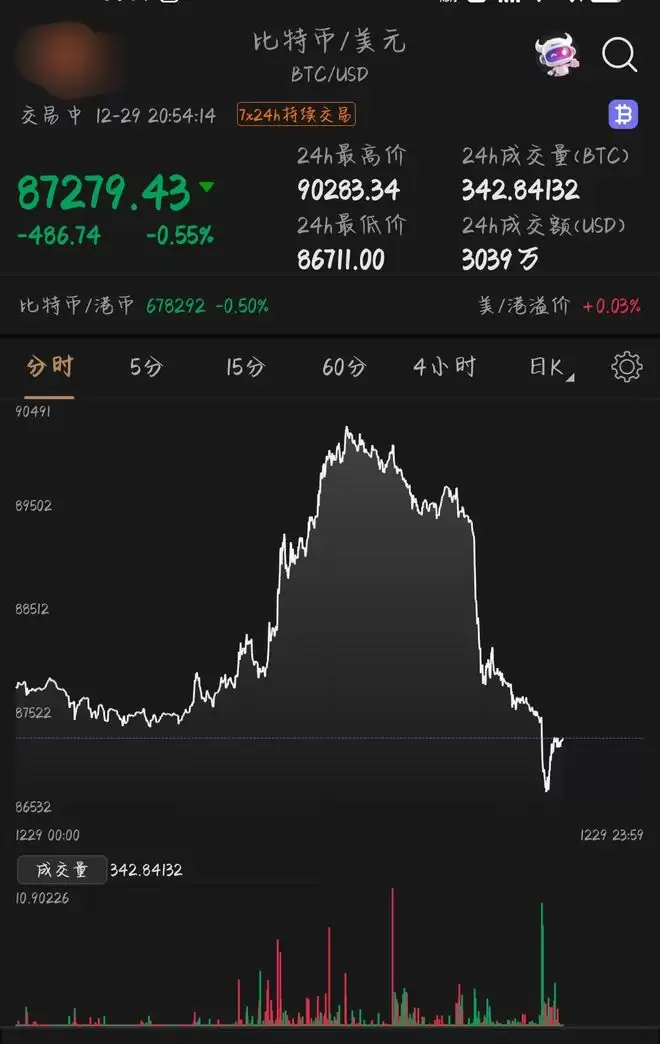 12月29日,除了黄金之外,比特币当天也上演了一波惊心动魄的过山车行情。行情软件显示,比特币价格先是回落至87000美元下方,随后盘中一度强势拉升,逼近90000美元关口。与此同时,以太坊也跌至2928.65美元,过去24小时内跌幅为0.43%。