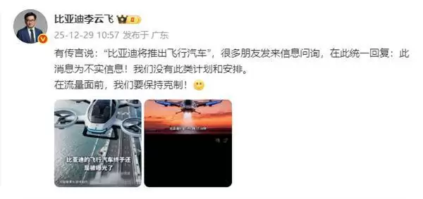 最近,关于“比亚迪即将推出飞行汽车”的消息在网上引发广泛热议,不少网友对此纷纷展开讨论。针对这一传闻,比亚迪集团公关处总经理李云飞专门发文进行了澄清。