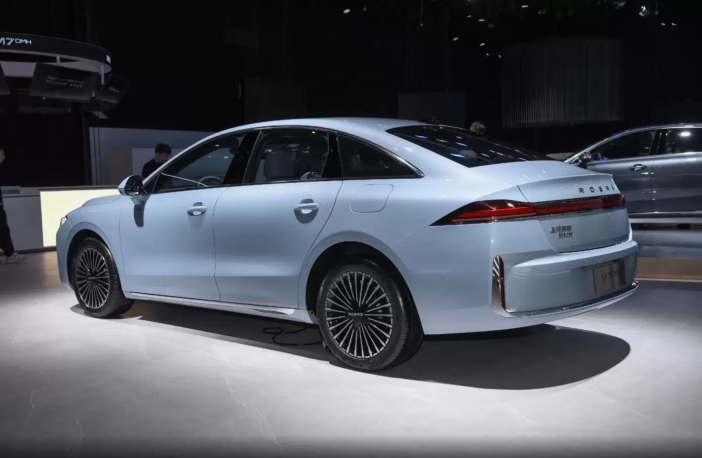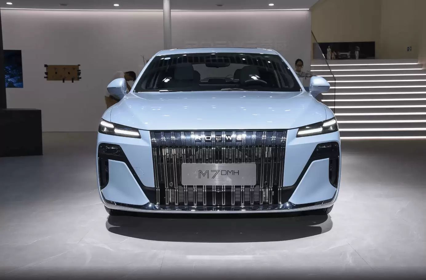 外观设计上,这款车打破了以往高性价比车型的常规印象。车头采用大面积直瀑式进气格栅,搭配狭长灯组,营造出强烈的视觉冲击力;侧面线条流畅,密集辐条轮毂与悬浮式车顶设计,进一步强化了豪华商务气质。这种设计语言通常出现在更高价位的车型上,而荣威M7+DMH将其下放至主流消费区间,颇具诚意。