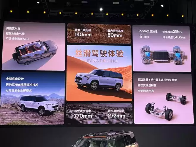 在越野能力方面,极石ADAMAS提供包括公路、山地、泥地、沙地在内的七种全地形驾驶模式,最大涉水深度为770mm,并具备100%爬坡能力。最新信息显示,该车通过了中汽研L3级进阶越野能力认证,在大交叉轴、鹅卵石路、大交叉坡及综合越野路况等13项测试中获得满分成绩,体现其在复杂路况下的通过性与系统稳定性。