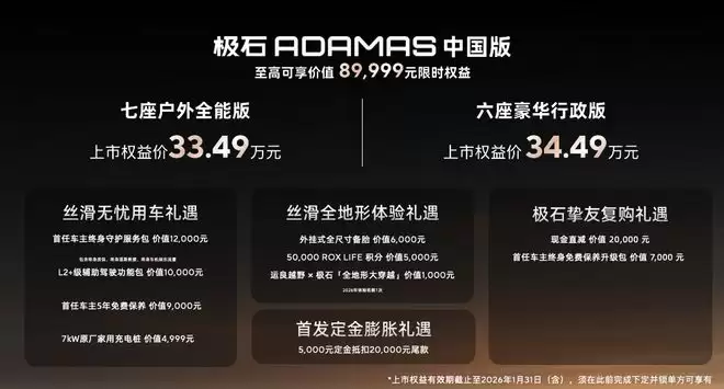在上市政策方面,极石汽车为ADAMAS中国版推出多项限时权益。2026年1月31日前下订并锁单的用户,可享定金膨胀、用车无忧及全地形体验等权益;极石01老车主复购ADAMAS,还可叠加终身免费保养及额外购车代金券。