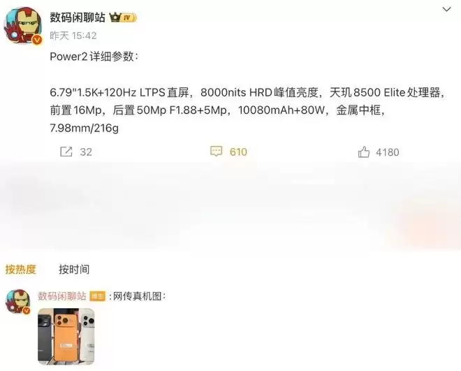 参考爆料信息,全新的荣耀Power2将配备一块6.79英寸的1.5K+120Hz LTPS直屏,其HDR峰值亮度高达8000nits。它采用金属中框设计,机身厚度为7.98mm,重量约为216克。其核心搭载了天玑8500+ Elite处理器,前置一颗1600万像素自拍镜头,后置则采用5000万像素F1.88主摄与500万像素镜头的组合。
