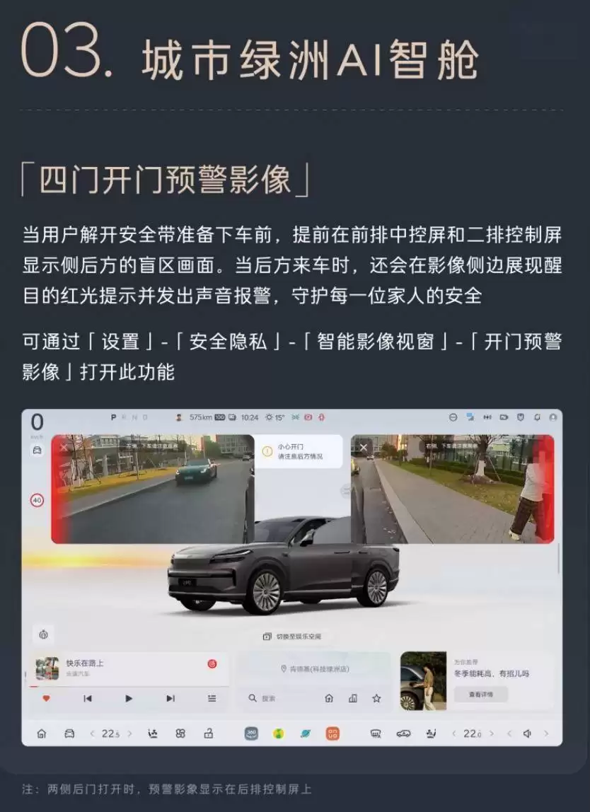 安全功能升级聚焦开门预警场景。城市绿洲AI智舱系统在用户解开安全带时,自动在中控屏与后排屏幕显示侧后方盲区影像。若检测到后方来车,影像侧边将闪烁红光并发出警报,用户可通过设置菜单开启此功能。蓝牙钥匙新增距离调节选项,支持近、中、远三档解锁范围设置,适配不同使用场景。