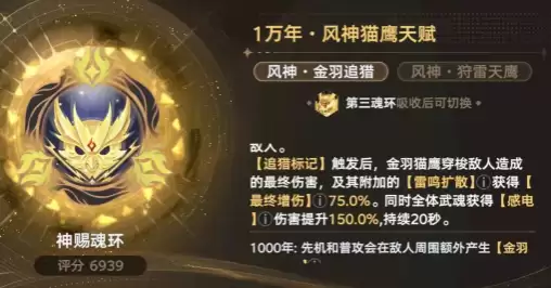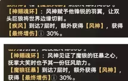 风笑天的神赐是名副其实的长途输出利器,它最高能提供30%的最终增伤,数值亮眼,但触发条件颇为苛刻。魔狼狂暴状态需要叠满7层,而这两个状态各自都需要三分多钟的启动预热。实测下来,在持续6分钟左右的长线作战中,它能稳定提升18%~23%的伤害。但如果地图时长只有四分半左右,增伤就降到了10%~15%。至于一两分钟的短线爆发,它几乎提供不了什么加成。当前版本中,持久战占比本就不高,加上风笑天自身的技能机制存在一些问题且属性较为偏科,除非你是专门打造长途阵容的深度玩家,否则这款魂环并没有太大的兑换必要。