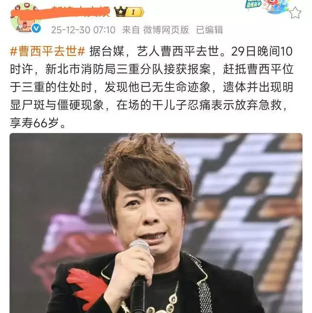 12月30日,娱乐圈知名艺人曹西平家中去世的消息冲上热搜。