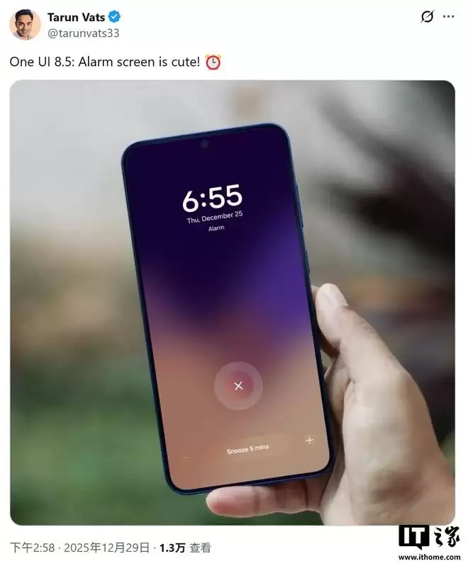 12月30日消息,据IT之家报道,消息源Tarun Vats日前在X平台发布推文透露,三星近期面向参与One UI 8.5测试的用户推送了时钟(Clock)应用更新,版本号升级至12.5.55.10,安装包大小约为56.17MB。