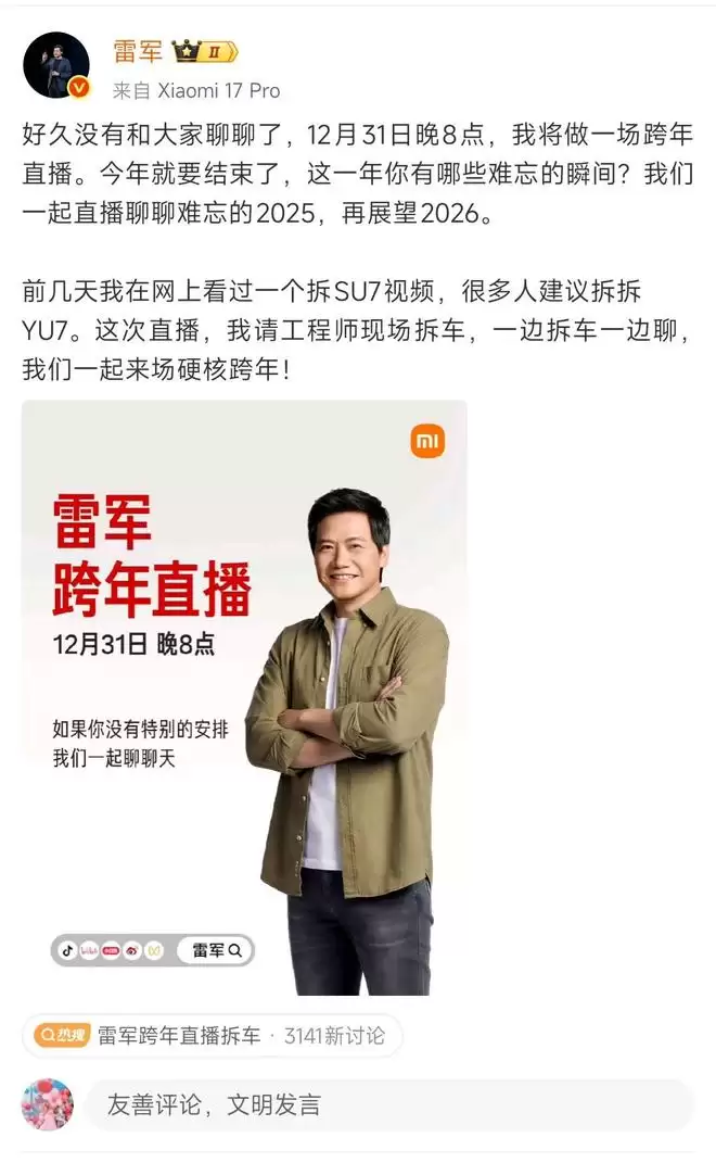 雷军还在微博里提到一件趣事。他说前几天在网上看到一个拆解SU7的视频,底下很多网友都在喊话,建议“拆拆YU7看看”。所以这次直播,他直接请来了工程师,要现场拆车!一边拆车,一边聊聊背后的故事和技术,带大家来一场硬核又热闹的跨年。