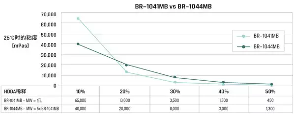 Bomar低聚物材料的粘度控制能力不仅在其纯态下至关重要,在稀释条件下同样展现出卓越的性能。例如,当在HDDA等非极性单体中进行稀释时,高分子量产品BR-1044MB在含10% HDDA下的粘度,会比相同稀释度下的低分子量产品BR-1041MB的粘度更低。这一现象反映出,随着稀释程度的增加,氢键密度逐渐降低,缠结效应成为影响粘度的主导因素。这一特性使得Bomar低聚物材料能够在广泛的应用场景中提供稳定可靠的性能支持。