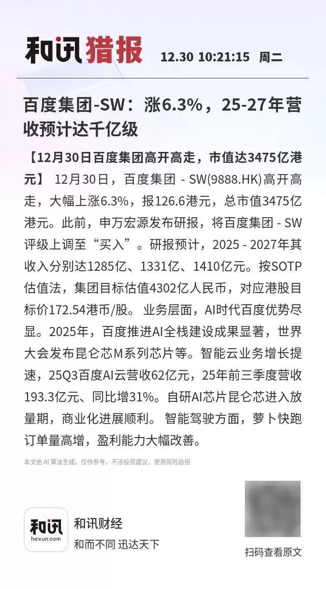百度AI全栈布局发力,股价上扬6.3%助推25-27年营收增长