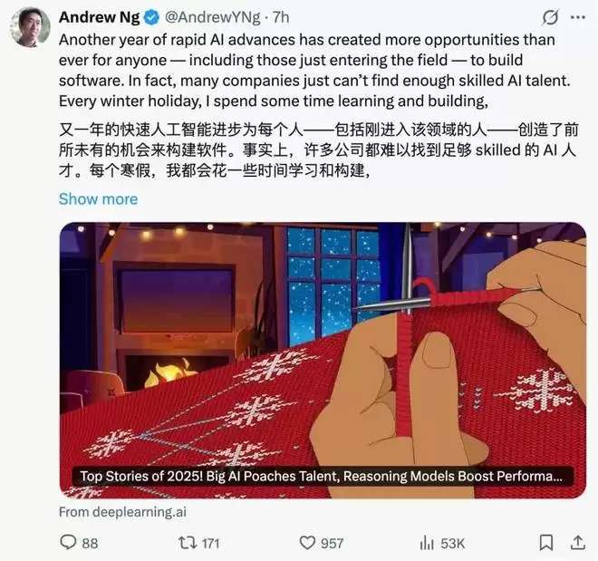 又一年,AI 以惊人的速度向前推进,为所有人 —— 包括刚进入这个领域的新手 —— 创造了前所未有的软件开发机会。事实上,许多公司现在最大的困扰之一,就是找不到足够多真正懂 AI 的工程师。