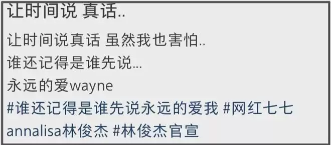 或许是歌手粉丝的敏感性,有粉丝看到七七的发文直接关联到了林俊杰创作的歌曲《记得》,里面写着“让时间说真话,虽然我也害怕,在天黑了以后,我们都不知道,会不会以后”,歌词句句都在表达爱人间的牵绊,若这样理解的话,七七就是在秀恩爱,表达了与林俊杰两人的坚定爱情。