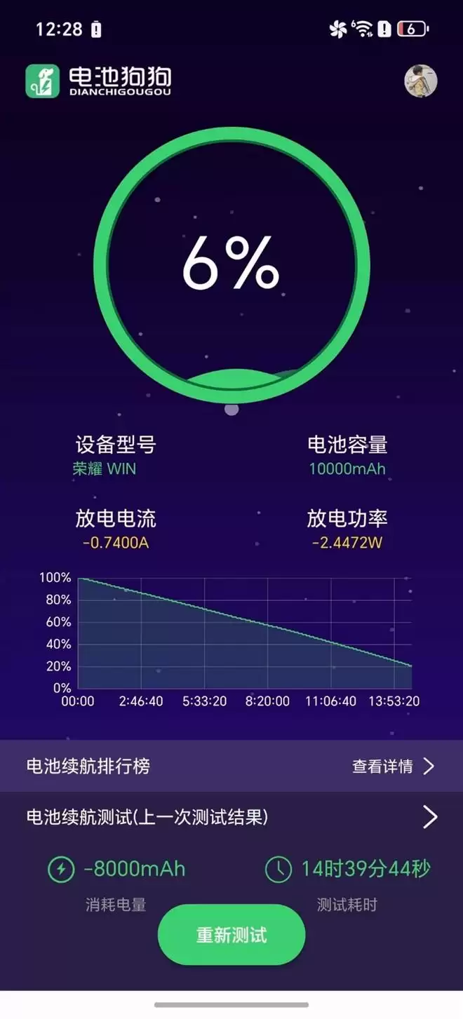 我们使用电池狗狗进行续航测试,从100%到20%,共放电8000mAh,荣耀WIN共坚持了14小时39分钟。