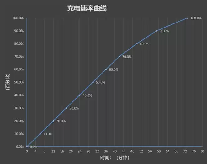 此后会有充电速度略有降低,充满100%一共花掉了73分钟时间。