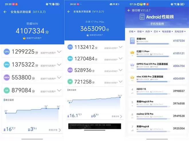 而这,仅仅是荣耀WIN的开胃小菜。它真正的惊艳之处,在于极致的性能释放、碾压级的续航表现,以及高负荷下比竞品更低的温度。