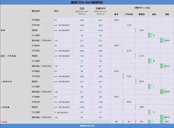 我们测试了4款游戏,平均下来,相同的帧率下,荣耀WIN比另外一款搭载骁龙8 Elite Gen5的功耗要低了4%。