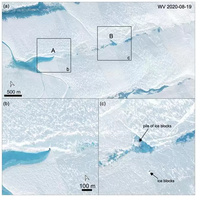 融水的影响远不止于此。研究人员分析航拍照片发现,裂缝两侧的冰面出现了高度差,仿佛一侧被抬得更高。最显著的抬升发生在湖泊正下方,巨量融水灌入冰下,形成了一个类似“水泡”的冰下湖,将上方的冰川向上推高。