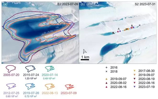 科学家早在1995年就从观测数据中发现了这个面积达21平方公里的融水湖。自那时起,湖水便开始通过冰层中的通道和裂缝,反复而突然地排干。研究人员共记录了七次主要的排水事件,其中四次发生在过去五年内,显示其发生频率正显著增加。