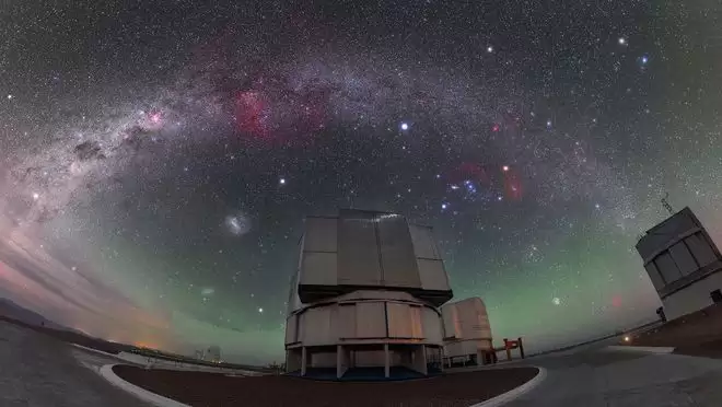 位于智利的欧洲南方天文台甚大望远镜(VLT)上方的星空。恒星R Doradus位于图像中心望远的左侧,靠近大麦哲伦星云,图中大麦哲伦星云呈现为天空上一片明亮的模糊光斑。图源:P. Horálek / ESO