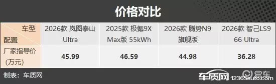 四款车型在动力系统上呈现出显著的分化。智己LS9是唯一采用增程式动力的车型,其CLTC纯电续航里程表现突出,且定价更具亲和力,堪称性价比之选;其余三款均搭载插电式混合动力系统,售价集中在44万至47万元区间。其中,极氪9X与腾势N9配备2.0T发动机,岚图泰山与智己LS9则采用1.5T发动机。不过,极氪9X的发动机最大功率与腾势N9的电机总功率在参数上更占优势。
