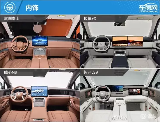 内饰布局与配置差异进一步凸显了品牌调性。岚图泰山与腾势N9延续了座舱沉稳规整的设计风格,极氪9X通过中控屏与副驾娱乐屏的一体式联屏强化视觉延伸感,智己LS9则以仪表盘与中控屏联动、副驾娱乐屏独立的三屏组合塑造科技交互中心。配置层面,岚图泰山、极氪9X与腾势N9均标配AR-HUD增强现实抬头显示、第三排座椅前后调节及车内PM2.5过滤装置。其中,岚图泰山独享第三排座椅通风功能,极氪9X配备真皮方向盘,腾势N9则提供后排手机无线充电与第三排座椅高低调节。智己LS9虽基础配置稍显简约,但其增程式动力与纯电续航优势依然具备强大的竞争力。