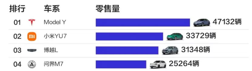 在2025年11月的SUV销量榜单中,特斯拉Model Y、小米YU7与问界M7分列前三甲(除第三名外),25万至35万级市场呈现出“三强争霸”格局。这三款车型凭借差异化定位与技术路线,成为消费者关注的焦点。对于预算30万元左右的购车群体,如何从这三款车中做出选择?本文将从设计、性能、智能化等维度展开深度对比。