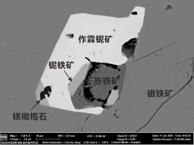 显微镜下,与磁铁矿、铌铁矿、镁橄榄石和赤铁矿等矿物共生的作霖铌矿背散射图像。(受访单位供图)