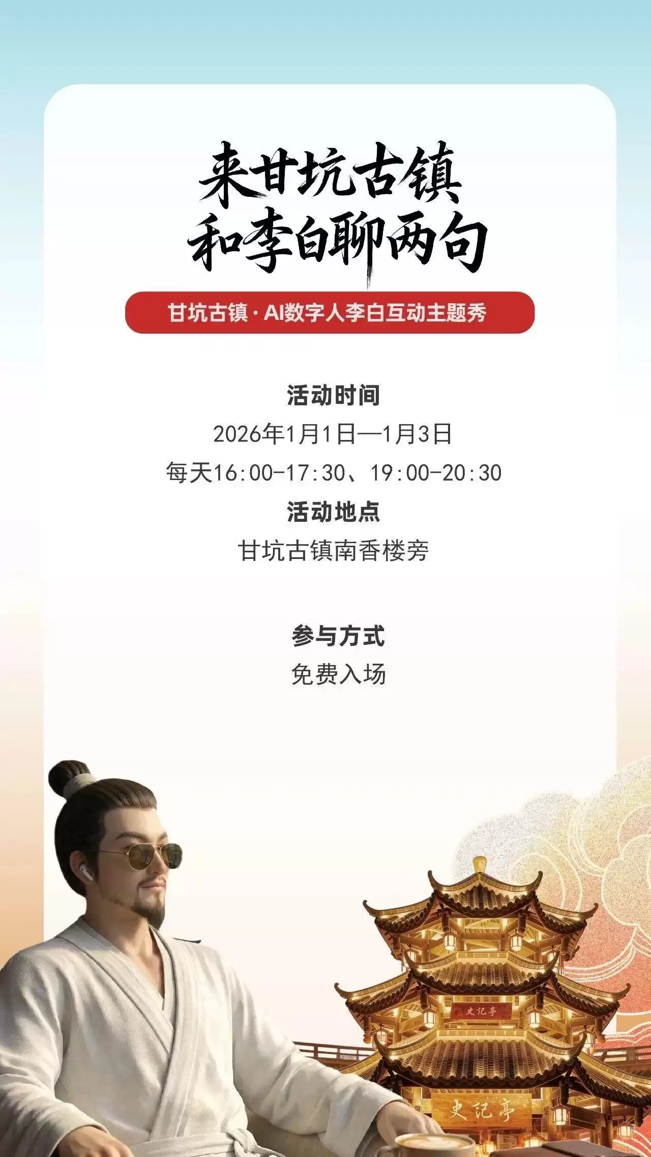 2026年元旦假期,还在纠结去哪儿玩吗?不如来深圳龙岗甘坑古镇,听听“诗仙李白”都聊些什么。近日,南都记者从龙岗区吉华街道获悉,为深入推进“All in AI”战略,打造“文旅+科技”融合新标杆,2026年元旦假期期间(1月1日-1月3日),吉华街道将联合龙岗区文化广电旅游体育局、华侨城文旅、NuwaAI共同推出重磅活动——“AI数字人李白互动主题秀”,届时将在甘坑古镇南香楼旁盛大亮相。
