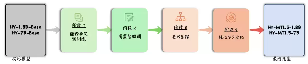 技术方面,HY-MT1.5-1.8B 能够用小尺寸实现大尺寸模型的效果,得益于On-Policy Distillation(大尺寸模型蒸馏)策略的引入。该策略让HY-MT1.5-7B作为Teacher模型,实时引导1.8B的Student模型,使其避免死记硬背标准答案,而是通过纠正在预测序列分布时的偏移,让小模型从错误中学习,持续提升能力。