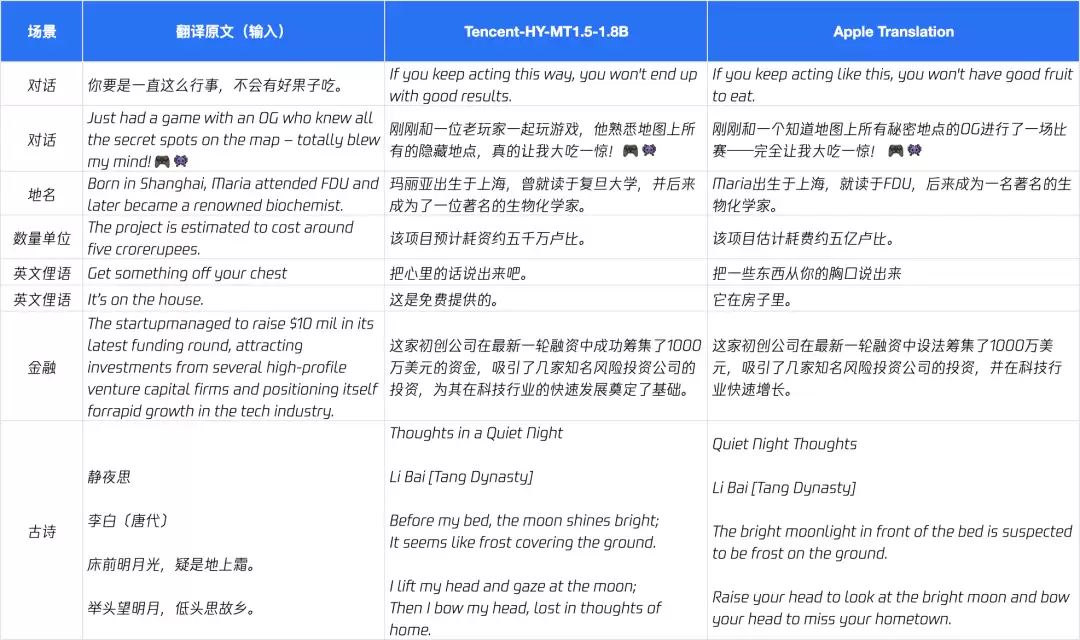 为了直观展示混元Tencent-HY-MT1.5-1.8B的翻译效果,最新展示中将其与苹果手机自带离线翻译的结果进行对比: