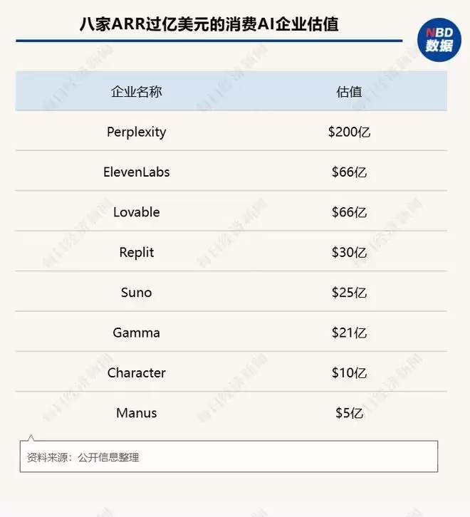 图为八家ARR过亿美元的消费AI企业估值