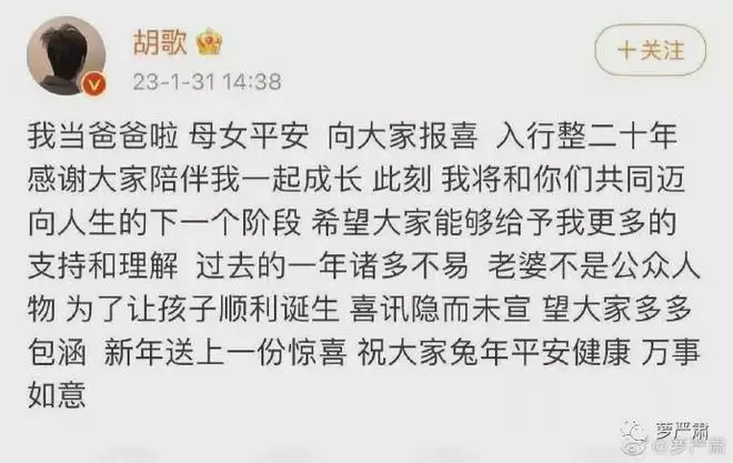 胡歌是生了孩子才承认有“老婆”的存在。