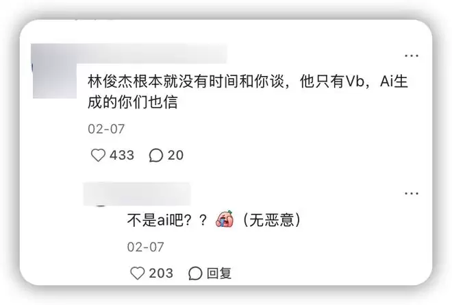 现在翻看七七的评论区,今年2月还有粉丝不相信恋情,说林俊杰没时间谈恋爱,并指七七是AI生成的美女。
