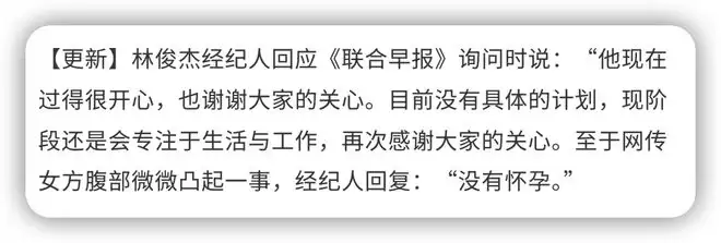 本次承认恋情之突然,不少人怀疑是因为女方已经怀孕,林俊杰经纪人回复媒体:“没有怀孕。”