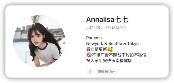 骂成这样,我上小红书一搜,她不就是发美图吗,简介还写着:纽约西雅图东京三地跑,不接广告不赚钱不约拍不回私信。