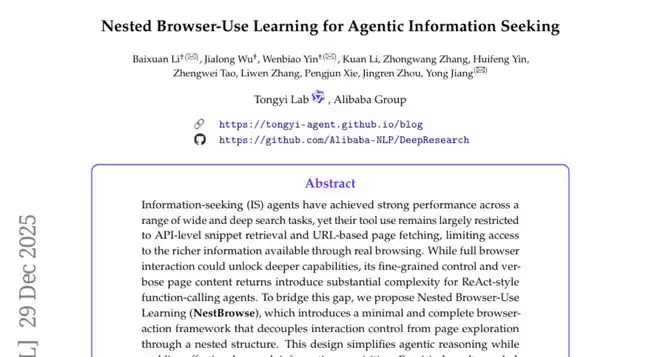 A:NestBrowse是阿里巴巴研究团队开发的一套AI网络浏览系统,它能让AI像侦探一样深度挖掘网络信息。与传统只能搜索和简单访问网页的AI不同,NestBrowse可以点击按钮、填写表单、与 交互,获取那些隐藏在网络深处的信息。