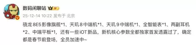 另外,这位博主还曾在爆料中提到过:“骁龙8E5影像旗舰*1、天玑8中端机*1、天玑9中端机*1、全智能表*1、两副耳机*2、中端平板*1,还有一些iOT新品,新机核心参数全都独家首发透露过了,确定都是春节前登场,全员加速中~”