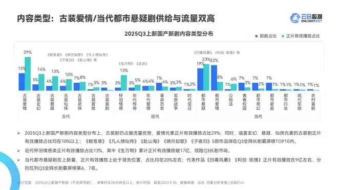 根据云合数据显示,2025 H1 上新国产剧中,现实题材与古言类作品有效播放占比均为34 %; 2025 Q3 上新国产新剧内容类型分布上,都市爱情、都市悬疑、古装爱情部数占比排在前三位。