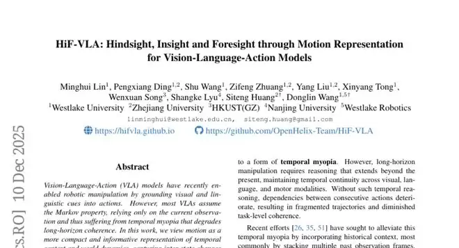 西湖大学的研究团队深刻认识到了这个问题。他们发现,现有的机器人虽然能够理解视觉信息和语言指令,但在执行需要多个步骤的复杂任务时经常会失败,原因就在于这些机器人缺乏时间记忆能力。研究团队提出了一个革命性的解决方案:HiF-VLA(Hindsight, Insight, and Foresight for Vision-Language-Action Models),这个名字听起来很复杂,但其实就是让机器人同时具备"回顾过去"、"理解现在"和"预测未来"三种能力的技术框架。