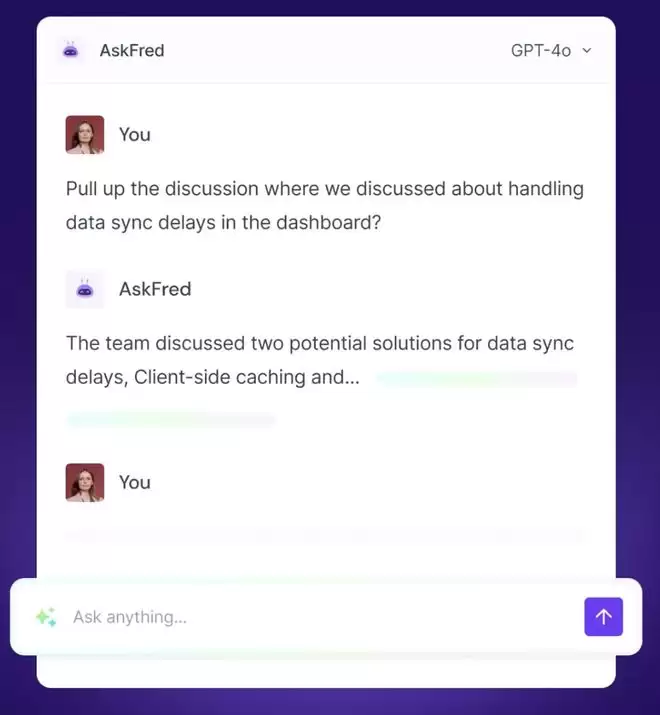 关键差别在于,AskFred是在了解整场会议上下文的前提下回答问题,它既能回顾(检索和摘要),也能生成新的内容,还具备一定的推理能力。