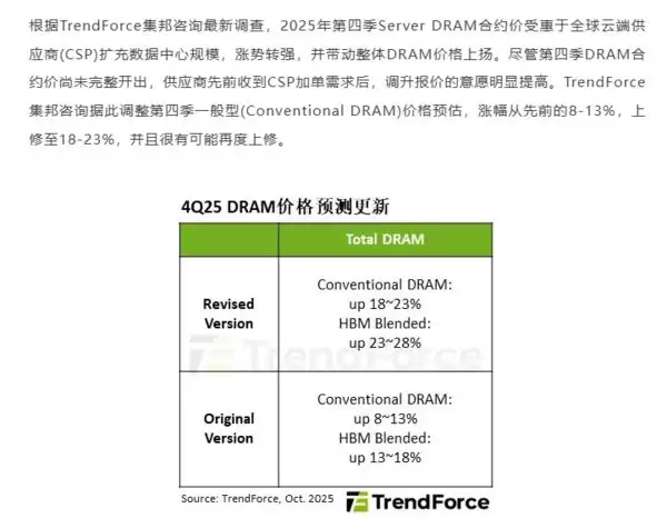 据CNMO了解,2025年第二季度起,DRAM价格出现了显著的反转。TrendForce报告显示,受AI服务器需求强劲及HBM内存产能紧张的影响,DRAM整体价格在第三季度出现了大幅上涨趋势。这是自2024年价格低谷后的第一个大幅反弹,预示着存储市场进入了新一轮的涨价周期。