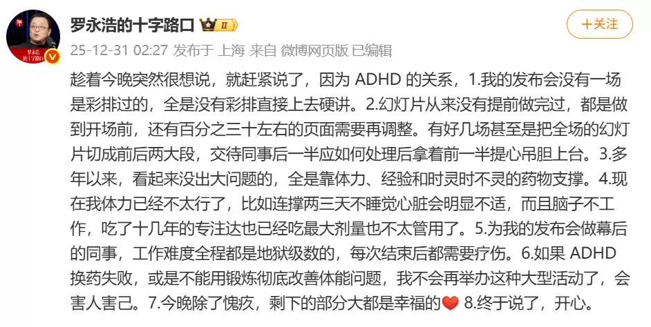 12月31日凌晨,十字路口年度科技与创新分享大会刚落幕,罗永浩便在微博上吐露心声。他坦言,由于ADHD(注意力缺陷与多动障碍)的影响,自己的发布会向来没有任何一场是经过彩排的,全都是未经预演就直接上台进行“硬核”演讲。不仅如此,所有的演讲PPT也从未提前完成过,往往在开场前仍有约三成的页面内容需要临时调整。