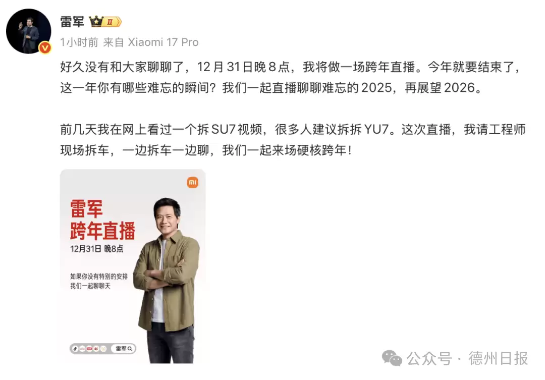 小米科技创始人雷军近日在社交平台宣布,将在12月31日晚8点开启一场特别的跨年直播活动。本次直播将聚焦汽车领域,为观众带来技术解析与互动体验。