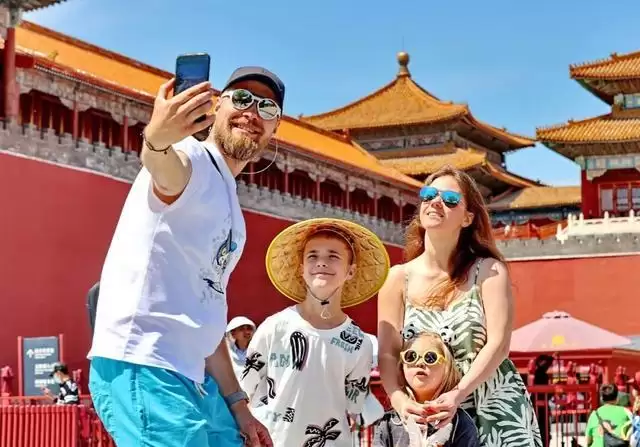 2025年5月6日,北京,外国游客游览故宫博物院。