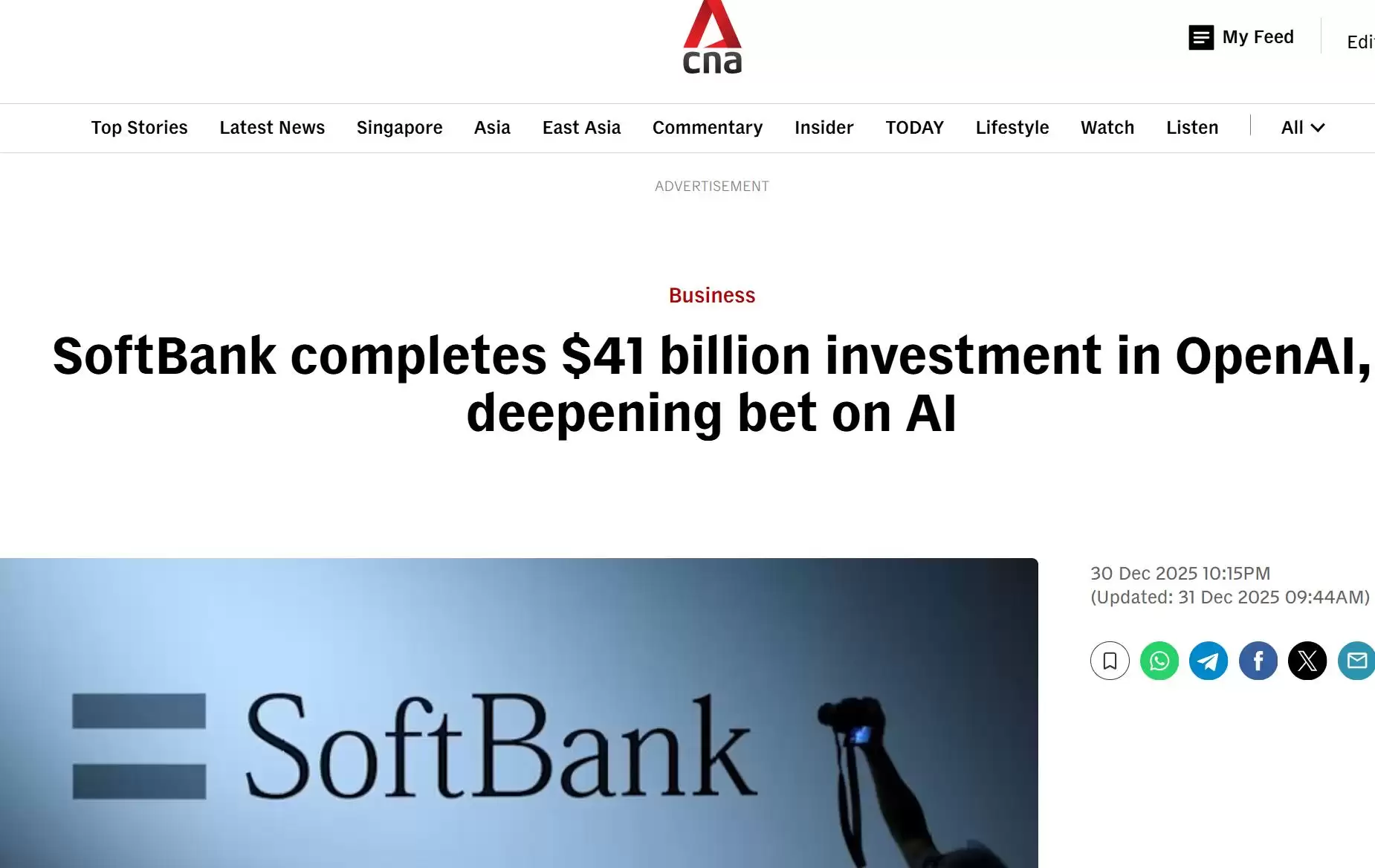 【环球网科技综合报道】12月31日消息,据cna援引路透社报道,软银集团已完成对人工智能公司OpenAI的410亿美元投资,成为该公司迄今规模最大的单一轮次私人融资之一。交易完成后,软银将持有OpenAI约11%的股份,进一步巩固其在全球人工智能竞赛中的战略地位。
