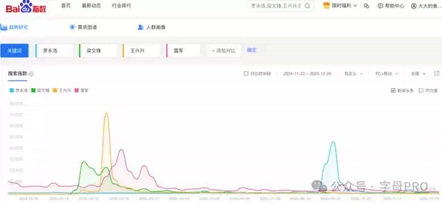 百度指数显示,罗永浩年内最高热度为47000,远超李佳琦和董宇辉。实际上,2025年,各路风流人物尽数登场,前有梁文锋和王兴兴,后有雷军,罗永浩的最高热度仅次于王兴兴,却超过了梁文锋和雷军。