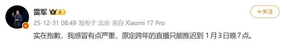 雷军感冒病情加重,跨年直播延至1月3日晚7点