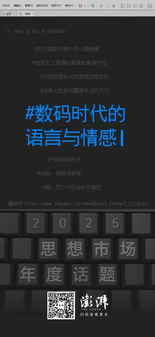 【编者按】2025年即将过去,短短一年间,我们见证了太多的变化。在这个信息爆炸的时代,人工智能的发展加速模糊了现实与虚拟的边界,不断涌现出的媒介形式争先恐后地抢夺着我们的注意力,无处不在的社交媒体已经开始影响青少年的心理健康。数码时代改变了我们的语言,甚至能操控情感……澎湃新闻·思想市场对本栏目在过去一年间刊发的稿件进行了回顾,尝试将反复出现的现象串连起来,从中梳理出了2025年的八个年度话题。在这次并不完备的翻检当中,我们希望短暂地跳出技术设定的视角,去反思我们与真实的世界的互动:去观察人们与动物、植物与食物的关系,去理解气候如何搅动社会,去感受世界主义的退潮,去体会爱、死亡与生命的可能性。当世界的声音越来越嘈杂,我们越要去倾听潜流正在向何方涌动。
